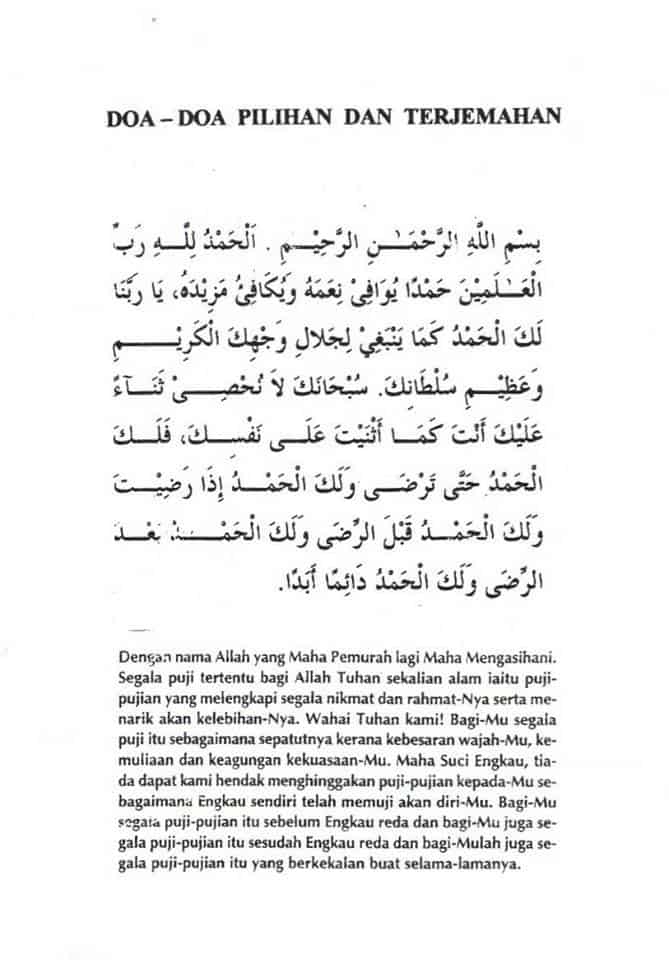 Dengan nama Allah yang Maha Pemurah lagi Maha Mengasihani. Segala puji tertentu bagi Allah, Tuhan sekelian alam. Iaitu puji-pujian yang melengkapi segala nikmat dan rahmat-Nya serta menarik akan kelebihan-Nya.
