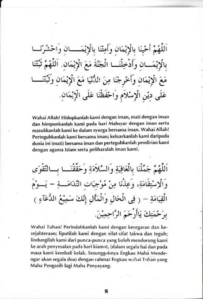 Wahai Allah! Perbaikilah agama kami yang ianya menjadi ‘pemeliharaan segala urusan kami’, perbaikilah hal keduaniaa kami yang ianya menjadi ‘tempat urusan hidup kami’, perbaikilah hal akhirat kami yang ianya menjadi ‘tempat kembali kami’, perbaikilah hubungan dan pergaulah kami serta perjinakkanlha hati di antara kami, jadikanlah hidup ini untuk kami menambah segala kebajikan serta jadikanlah mati itu sebagai tempat kelepasan iaitu kerehatan kami, dari segala macam kesusahan dan kejahatan.