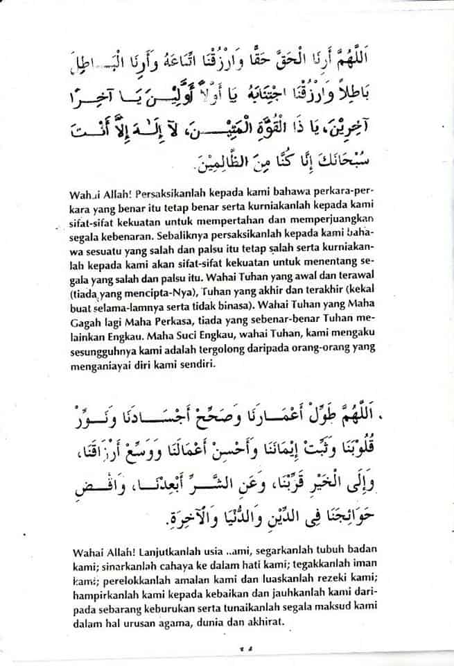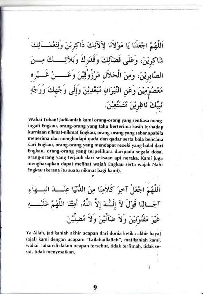 Wahai Allah! Tenteramkanlah kami dari segala malapetaka di dunia dan seksa di akhirat. Jauhkanlah daripada kami akan segala kejahatan di dunia serta kejahatan di akhirat dengan hak dan kebenaran kitab suci Al-Quran dan Nabi Engkau (Muhammad s.a.w.) yang mulia.