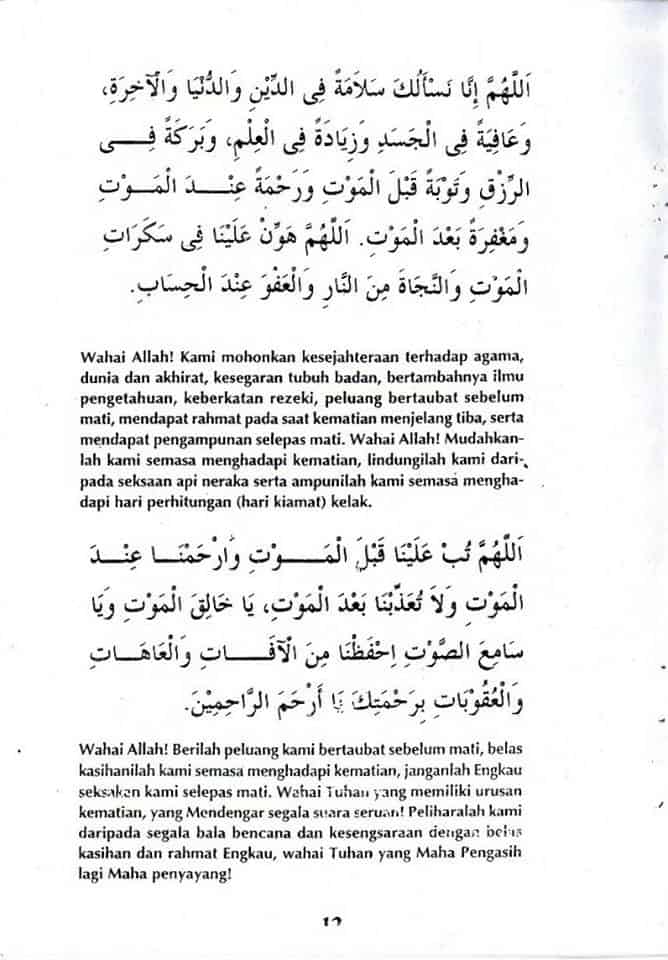 Wahai Tuhan yang memiliki urusan kematian, yang Mendengar segala suara seruan. Peliharalah kami daripada segala bala bencana dan kesengsaraan dengan belas kasihan dan rahmat Engkau, wahai Tuhan yang Maha Pengasih lagi Maha Penyayang!