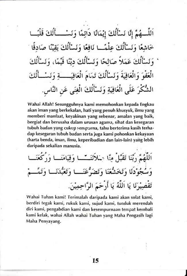 Sesungguhnya kami memohonkan kepada Engkau akan iman yang berkekalan, hati yang penuh khusyuk, ilmu yang memberi manfaat, keyakinan yang sebenar, amalan yang baik, bergiat dan berusaha dalam urusan agama, sihat dan kesegaran tubuh badan yang cukup sempurna, tahu berterima kasih terhadap kesegaran tubuh badan serta juga kami pohonkan kekayaan (harta benda, iman, ilmu, keperibadian dan lain-lain) yang lebih daripada sekalian manusia.