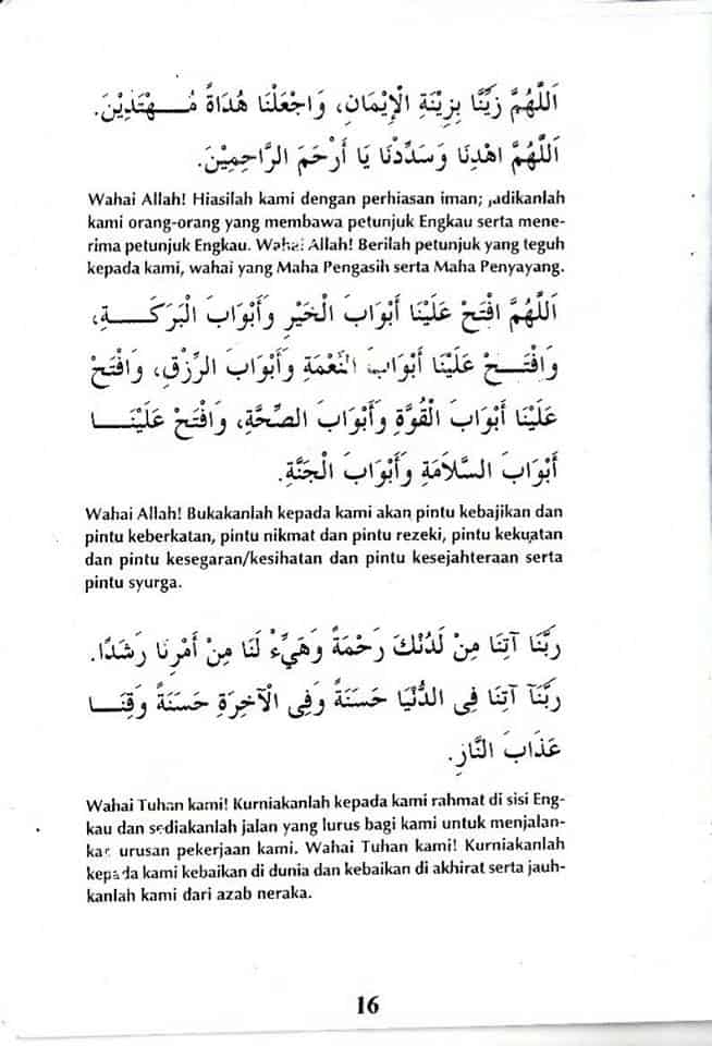 Wahai Tuhan kami! Kurniakanlah kepada kami rahmat di sisi Engkau dan sediakanlah jalan yang lurus bagi kami untuk menjalankan urusan pekerjaan kami.Wahai Tuhan kami! Kurniakanlah kepada kami kebaikan i dunia dan kebaikan di akhirat serta jauhkanlah kami dari azab api neraka.
