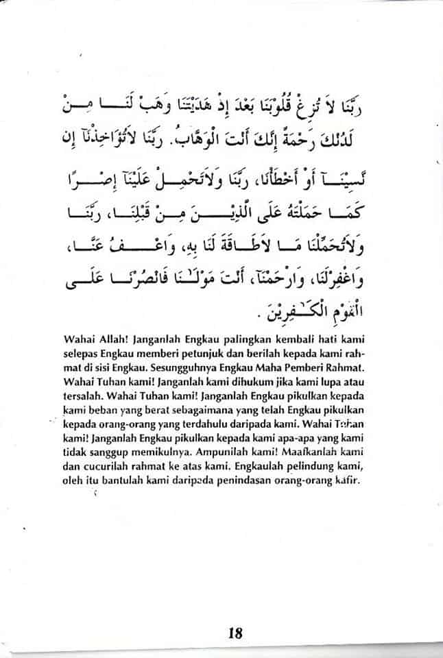 Wahai Allah! Janganlah Engkau palingkan kembali hati kami selepas Engkau member petunjuk; dan berilah kepada kami rahmat di sisi Engkau. Sesungguhnya Engkau Maha Pemberi Rahmat. Wahai Tuhan kami! Janganlah kami dihukum jika kami lupa atau tersalah. Wahai Tuhan kami! Janganlah Engkau pikulkan kepada kami beban yang berat sebagaimana yang telah Engkau pikulkan kepada orang-orang yang terdahulu daripada kami. Wahai Tuhan kami! Janganlah Engkau pikulkan kepada kami apa-apa yang kami tidak sanggup memikulnya. Ampunilah kami! Maafkanlah kami dan cucurilah rahmat ke atas kami. Engkaulah pelindung kami, oleh itu bantulah kami daripada penindasan orang-orang kafir.